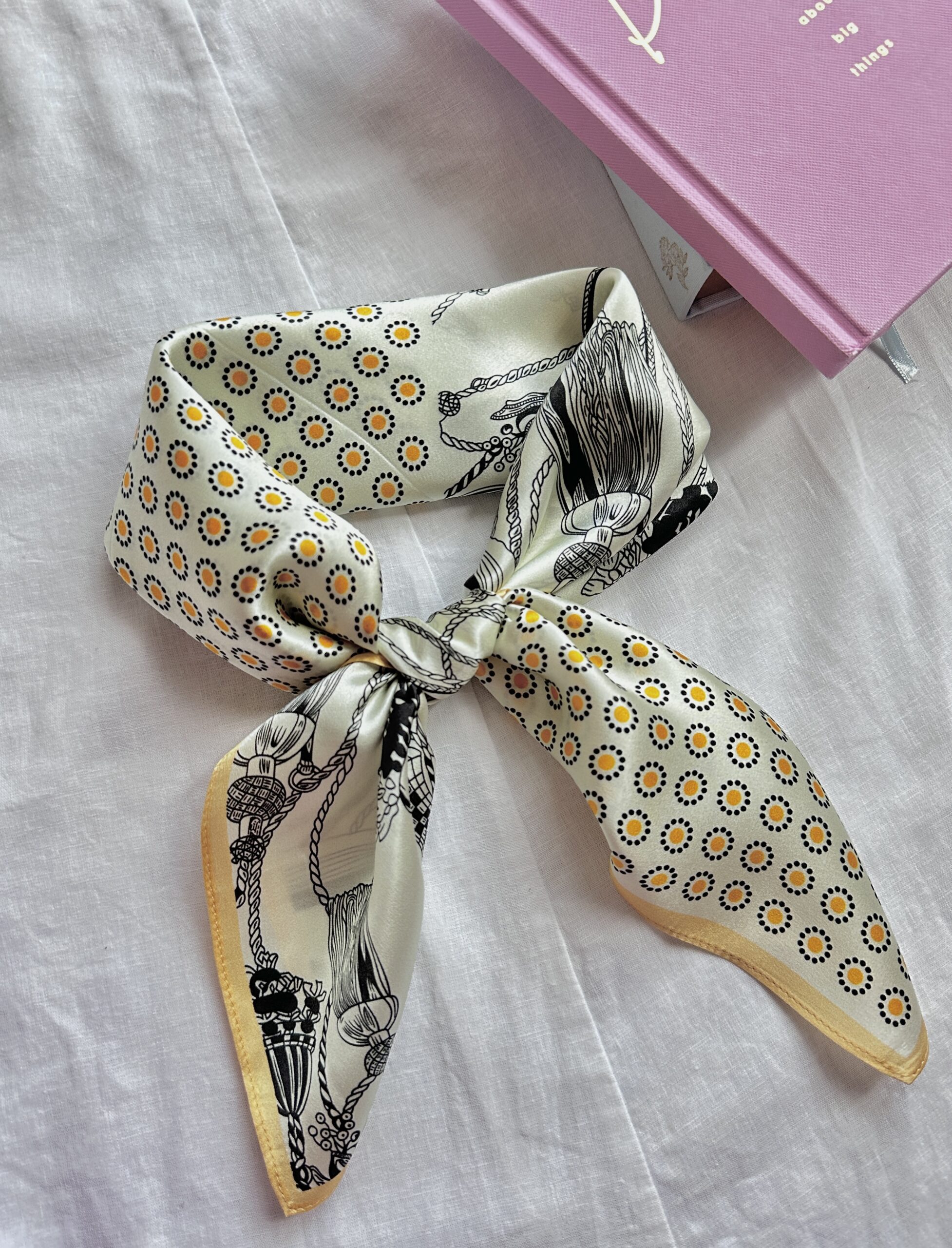 Dzięki uniwersalnemu rozmiarowi (ok. 65 × 65 cm) możesz go nosić klasycznie na szyi, jako opaskę na włosy lub ozdobę do torebki.