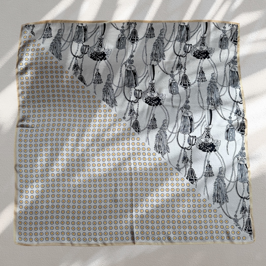 Dodaj wyrazisty akcent do swojej stylizacji dzięki jedwabnemu szalikowi „Słoneczny dzień”. To elegancki, kwadratowy szalik wykonany w 100% z naturalnego jedwabiu, który łączy dwa kontrastujące wzory – drobne, żółte kwiatuszki oraz stylowe czarne chwosty.